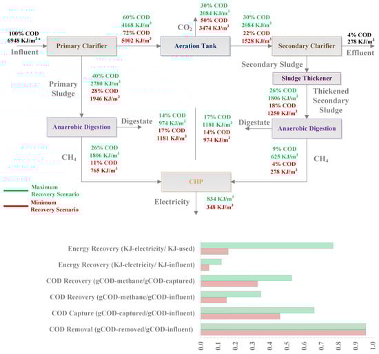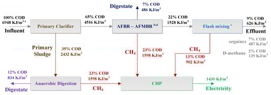 Concurrently, within the solids stream, the primary sludge and the thickened secondary sludge are digested and converted into biogas in the anaerobic digesters (AD). In addition to moisture and other impurities like hydrogen sulfide, the AD-driven biogas consists of 50–70% methane (CH4) and 30–50% carbon dioxide. It can be employed to generate electricity using combined heat and power (CHP) technologies [20]. Combined, the sludge captured from primary and secondary clarifiers and directed to the AD represents about 46–66% of the influent TCOD, as shown in Figure 2. The combined conversion efficiency for the collected sludge to methane can theoretically reach 0.86 gCOD-CH4/gCOD-sludge [2,17]. However, the actual conversion efficiencies are much lower. It has been reported that primary and secondary sludges conversion efficiencies to methane are 0.4–0.65 and 0.2–0.35 gCOD-CH4/gCOD-sludge, respectively [12,21]. As a result, the fraction of the COD recovered as methane is nearly 15–35% of the influent COD, which results in around 5–12% COD recovery in the form of electricity, given that the electricity efficiency of CHP technologies average at 35% [22]. COD and energy balances for typical configuration of CAS-WWTPs are illustrated in Figure 2 assuming maximum and minimum efficiencies.