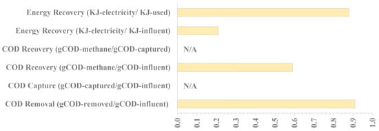 Expected COD and Energy balance for An-WRRF. a: 6948 kJ/m3 is based on assuming an influent with 500 mg-COD/L as an average value for municipal wastewater, b: values obtained according to Reference [42], c: values obtained according to Reference [43], d: 13% of the influent COD is converted to carbon dioxide, sulfur, and losses, N/A: Not Applicable.