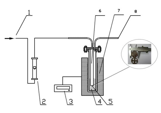 Schematic of the molten salt reactor setup: 1—gas inlet, 2—flowmeter, 3—thermal couple, 4—molten salts, 5—plate, 6—reaction tube, 7—electric furnace, 8—gas sampling outlet.