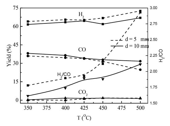The syngas product composition changed dramatically when the molten salt temperature rose. As shown in Figure 2, under all reaction temperatures, the gas product had a higher H2 content and a lower CO content with smaller plate openings. Between 350 °C and 500 °C, the main content of the gas products, namely, H2 and CO, varied from 61.6–72.6% and 24.8–38.1%, respectively. At all experimental temperatures, the CO2 content was less than 1.8%. H2 and CO exhibited a trend that was directly related to temperature. The H2/CO ratio increased from 0.94 to between 1.5 and 2.9, which can meet the requirements of most synthetic processes.
