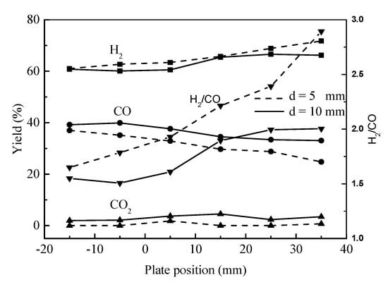 A coordinate system was established by putting the origin at plate 5, as shown in Figure 1, and defining the upward direction as positive. The influence of the molten salt static liquid height on the gas product content was studied. As shown in Figure 5, for plate with hole diameter 10 mm, the H2 and CO content in the gas product was 60.8–71.7% and 24.8–39.2%, respectively, when the plate position varied between −15 mm and 35 mm. Under all experimental conditions, the CO2 content in the gas product was less than 2%.