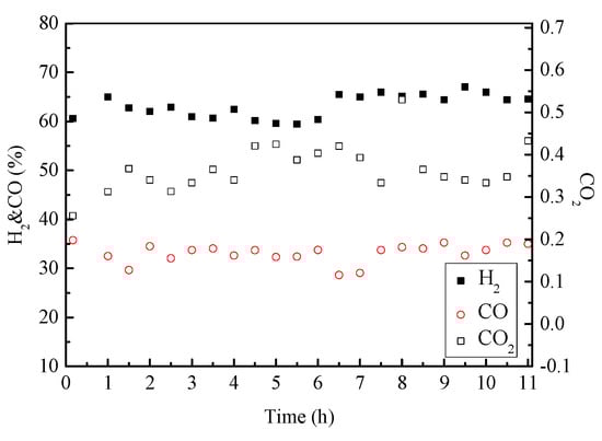 Syngas composition as a function of time (temperature: 400 °C, plate position: 15 mm, superficial gas velocity: 2.95 mm/s).