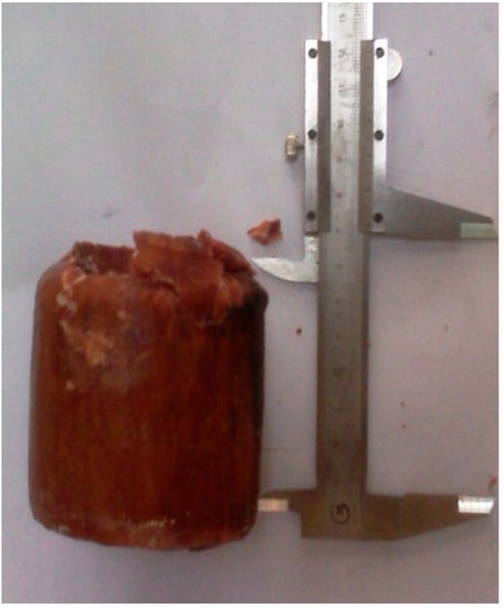 An 11-hour experiment was conducted to study the stability of the molten salt raw syngas conditioning. As shown in Figure 6, the gas product content was relatively stable throughout the experiment; the H2 and CO contents ranged between 65.8% and 33.7%, respectively, and the CO2 content was stable at 0.4%. Solidified molten salts were taken out after cooling. As shown in Figure 7, the salt mixture coagulum was a reddish color because small amounts of Fe oxides were mixed into it.