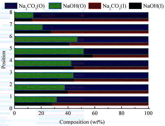 The solidified molten salt, shown in Figure 7, was cut into eight slices from bottom to top and two slices from the inside to the outside. The original molten salt content was 91.7 wt% NaOH and 8.3 wt% Na2CO3. After the experiment, the average molten salt content was 37.7 wt% NaOH and 62.3 wt% Na2CO3 for the outer slice and 35.9 wt% NaOH and 64.1 wt% Na2CO3 for the inner slice, as shown in Figure 8. The NaOH in the molten salt absorbed CO2 and converted it into Na2CO3. This conversion occurred in the outer slice slightly more than that in the inner slice. The highest NaOH content appeared at 45 mm in the molten salt where plate 5 was placed in the experiment, as shown in Figure 1. From the 45 mm slice to the top or the bottom of the molten salts, the Na2CO3 content increased, and the majority of the Na2CO3 was found in the top layer of the molten salts. This result may have occurred because raw syngas stayed at the molten salt surface after the gas bubbles broke and continued to react with the molten salts, as in reaction (3), which converted NaOH to Na2CO3 by absorbing CO2. Moreover, the density of Na2CO3 is 2.54 g/cm3, which is slightly greater than the density of NaOH (2.13 g/cm3) [22,23]. During the experiment, Na2CO3 gradually sunk to the bottom of the reactor.
