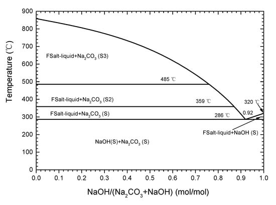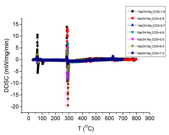 Figure 9 and Figure 10 show the phase diagram and the DSC (Differential Scanning Calorimetry) differential curve (DDSC) of the NN molten salt mixture. It can be seen that when the molar ratio of NaOH and Na2CO3 varied between 9:1 and 7:3, the NN molten salt endothermic peak temperature was almost the same. NN molten salt has only two endothermic peaks: the first endothermic peak is near 100 °C, which is because NN molten salt absorbs water easily, where this peak is the endothermic peak of the evaporation of water and decomposition of sodium carbonate hydrate in the molten salt; the second endothermic peak is around 292 °C, and the peak temperature was slightly higher than the literature value of the melting point of NN molten salt. It can be seen that for NaOH:Na2CO3 molar ratios in the range of 9:1–7:3, NN will partially melt around 292 °C, where unmelted NaOH or Na2CO3 will disperse in the liquid molten salt under gas agitation to form a turbid suspension mixture.