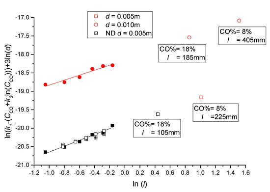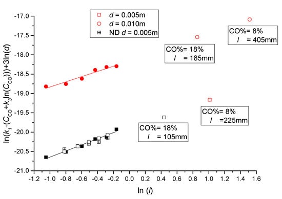 Figure 11 and Figure 12 are straight lines generated by processing experimental data using Equation (25). The real bubble diameter is related to the viscosity, plate hole diameter, temperature, and so on. There are still no published results on the relations between the bubble diameter and the above-mentioned variables. Therefore, the bubble diameter in Equation (25) was estimated using the hole diameter of plate 5 in Figure 1 [27]. The processed data are shown as straight lines in Figure 11 and Figure 12. Straight lines fitted using experimental data that were determined using different hole diameters have the same slope but different y-intercepts. This result implies that in the molten salt liquid, the diameter of the gas bubbles did not increase linearly with the diameter of the plate holes. The relationship of the bubble diameters and the plate holes requires further study. A new set of experimental data was obtained by using a different syngas (35% CO, 30% CO2, and 35% H2) and a plate hole 0.005 m in diameter. The new data were also processed using Equation (28) and marked as New Data(ND) in Figure 11 and Figure 12. It can be seen that the prediction results of the equation obtained in this paper were in good agreement with the new data. Furthermore, it can also be predicted that for plates with a hole 0.005 m in diameter when the plate position was 105 mm and 225 mm, the H2 composition of the outlet gas was 80% and 90%, respectively.