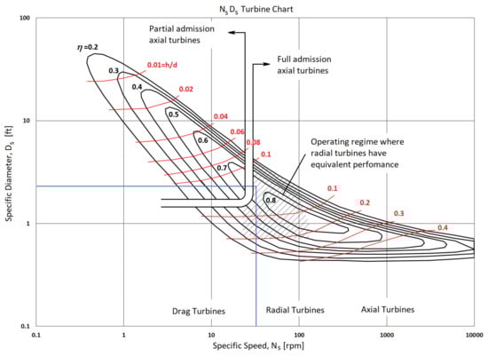 Working point on the Balje’s diagram (diagram derived from Reference [50]).