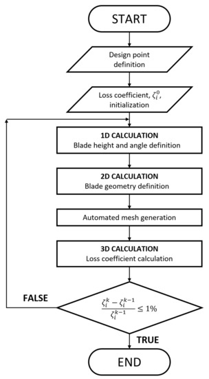The proposed methodology is necessarily iterative since the turbine geometry depends on the loss coefficients, but these depend on the turbine geometry. The procedure stops when the generic loss coefficient, , at the iteration, differ less than 1%, from the value at the previous one, (see Figure 2).