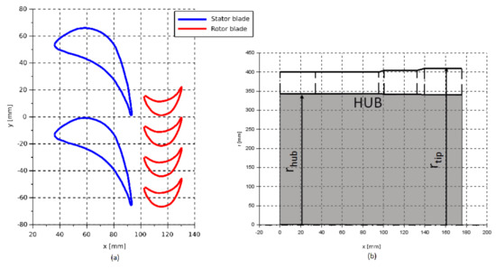 Blade geometry of the test case TK9-TW3 turbine: (a) blade-to-blade plane; (b) throughflow plane.