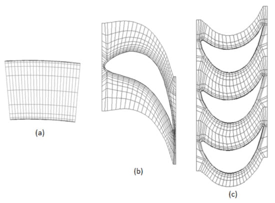 Mesh distribution for 125 k cells. (a) radial distribution (b) stator vane distribution (c) rotor vane distribution.