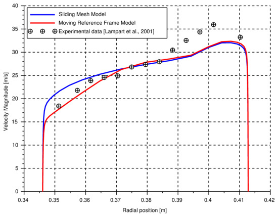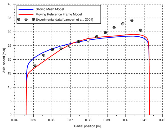 As reported in Figure 7, Figure 8 and Figure 9 and from Table 2, MFR and SMM provide approximately the same results since the Mean Square Error Percentage (MSEP) shows minimal differences between the two models. Particularly, the tangential speed shows the best agreement between experimental data and the computational results. The value of the axial speed at the tip is underestimated by both the models, whilst at the hub the axial speed is underestimated or overestimated if the MRF or the SMM are used, respectively. The absolute speed differences can be found at the hub and at the tip. In detail, at the hub the simulation results match the experimental trend, whereas the models underestimate the axial velocity at the tip. Indeed at the hub it is possible to observe the same trend as the axial speed, whilst at the tip the simulation tends to underestimate the value of the absolute speed.