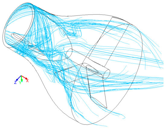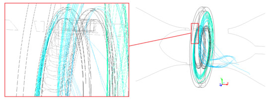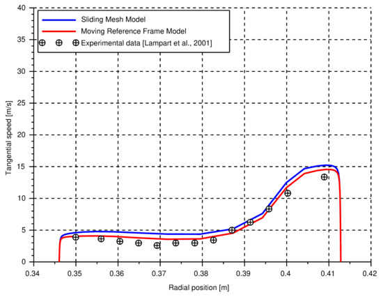 In detail, the MRF model [61] is a steady-state approximation in which different rotational and/or translational speeds can be assigned to individual cell zones. The flow in each moving cell zone is solved using the moving reference frame equations. It is worth noting that the mesh relative motion of adjacent zones is not considered by the MRF approach. Hence, the moving parts are frozen and the flow field is calculated by neglecting the relative motion of the moving zones. The MRF model is suitable in nearly uniform flow at the interface between adjacent moving/stationary zones (“mixed out”).
