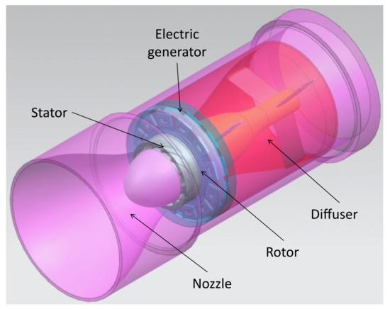 The turbine under investigation is composed by a nozzle, a single stage axial turbine, and a diffuser (Figure 10). In the 3D CFD calculation, the computational domain includes all the parts of the machine, considering air as an ideal gas. Furthermore, the design involves both the loss coefficients of the nozzle, , and of the diffuser, .
