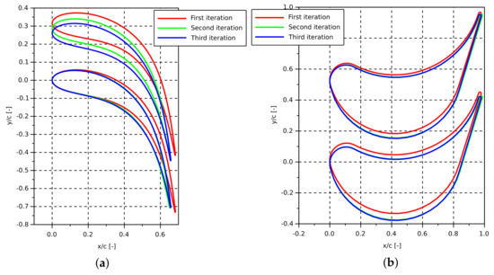 (a) Stator and (b) rotor blade shapes at different iterations.