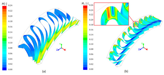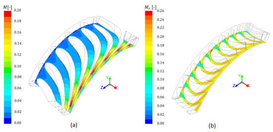 This behaviour is also confirmed by Figure 13, which reports the absolute and the relative Mach number contours for the stator and the rotor, respectively. Again, the absolute Mach number in the stator evidences the flow acceleration in the stator whereas the relative Mach number shows only minimum variations especially after the leading edge. Due to the impulse behaviour of the rotor, actually the work extraction is mainly due to the change of the flow direction rather than its acceleration, which is negligible.