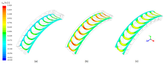 The results of this last simulation (the one characterized by the finest used mesh) are summarized in Table 6 together with those obtained with the starting coarse mesh, for comparison. Actually, the mesh used during the convergence procedure underestimates the performance of the turbine. Furthermore, from Table 6 it is possible to observe that the turbine designed with the proposed tool allowed us to reach the desired results. Indeed, under the design working conditions in terms of flow coefficient () and expansion ratio (), the turbine gives a loading factor, , more than twice the minimum expected value of (Table 6).