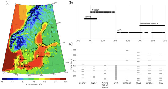 (a) Locations of the observations and the average wind speed at 150 m above ground level (2009–2018) from UERRA; (b) Available time periods in the observations; (c) Measurement heights in the observations and height levels used from the reanalyses (see Section 2.2). For MERRA2 and ERA5, the heights shown are the average heights of the model levels.
