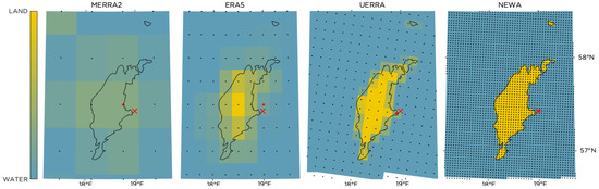 Land/sea-mask from the four reanalyses used in this study for the area around Östergarnsholm (location of observations marked with ×). The portion of land in each grid box is indicated with a color scale, ranging from blue (water) to yellow (land). Just west of the island Östergarnsholm is the much larger island Gotland. All grid points in the area are marked with black dots, and the grid point closest to the position of the observation is highlighted in red.