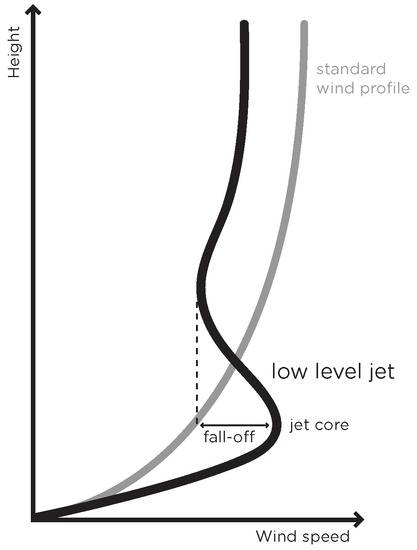 A low-level jet (LLJ) is a local wind maximum in the lowest part of the atmosphere, typically with the core located at a 50–300 m height. While there is no strict definition of an LLJ, it is often considered that the fall-off from the core has to be at least 1 or when comparing with the minimum value in the wind profile a few hundred meters above the core; see Figure 3 for an illustration.