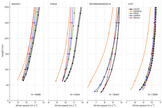 Regarding the large biases for FINO2, no plausible explanation was found, as this is a pure offshore site with at least 35 km to the closest shoreline and the closest grid point in the reanalyses also in a close range. The small amount of data that went into the profile for FINO2 could be a possible explanation for the large spread. A much better agreement was achieved comparing the reanalyses with 10 years of data from the FINO2 tower up to 100 m (not shown). The FINO2 LiDAR was quality controlled against the FINO2 tower (see Section 2.3), taking the flow distortion from the tower into account [81], but even after this quality control, it is evident from Figure 4 that the FINO2 profile is significantly different from the others. Thus, the FINO2 LiDAR data could be considered to have lower data quality than the other sites, and therefore the results including measurements from FINO2 should be interpreted with some caution.
