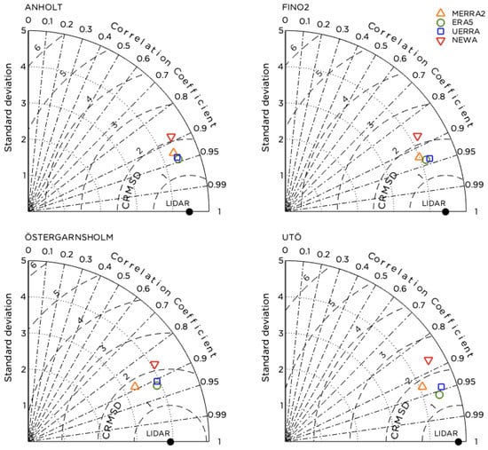 Figure 5 shows the Taylor diagrams at a 150 m height (a typical hub height for future offshore wind turbines) from the four sites. Analyzing the diagrams, it is clear that MERRA2, ERA5, and UERRA were more tightly coupled to the observations in time than NEWA, as they had higher correlation coefficients (ERA5 had the best performance). This was not surprising considering the frequent updates of the analysis fields in those products compared to the long forecasts used in NEWA; see Table 1. This result is also in line with the NEWA benchmark [82], where a LiDAR device on a ship was measuring along a track over the southern Baltic Sea, concluding that for wind speeds at a 100 m height, ERA5 had a higher correlation () than NEWA ().