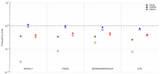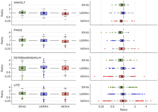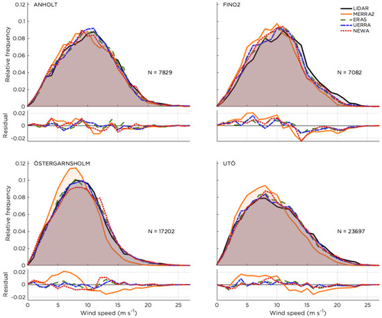 Looking at the residuals in Figure 6, it is evident that MERRA2 overestimated the frequency of low wind speeds and underestimated stronger winds for all sites. For FINO2, this was the case for all reanalyses. However, the opposite was true for Anholt and Östergarnsholm. Here, ERA5, UERRA, and NEWA slightly underestimated the 5–10 winds, and overestimated the winds stronger than . For Utö, there was a tendency that ERA5, UERRA, and NEWA overestimated the low wind speeds and underestimated the stronger winds just like MERRA2, even though the residuals were very small.