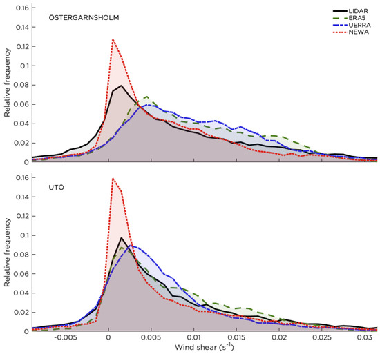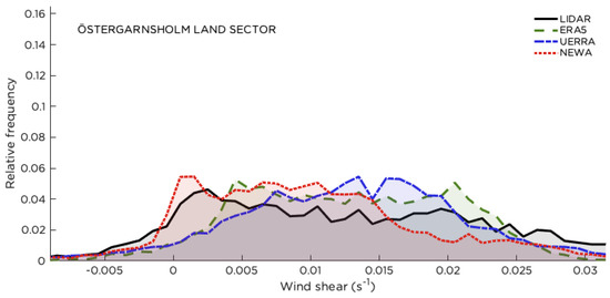 The average wind shear distribution for Östergarnsholm was significantly different when the wind was directed from land compared to open water. While the distribution for the open sea sector was similar to the one shown in Figure 7, the distribution when the wind direction was from land (Figure 8) was much flatter and, as expected, indicated more cases with higher shear. However, even for the land sector, ERA5 and UERRA still overestimated the positive shear, except for values above . NEWA overestimated the positive shear up to , but then underestimated the occurrence of stronger shear. Another possible explanation for the general overestimation of the shear by ERA5 and UERRA could be that the diffusivity in the turbulence schemes used in these reanalyses (see Section 2.2) is too small. The division of the wind direction into different sectors for Östergarnsholm followed [36].