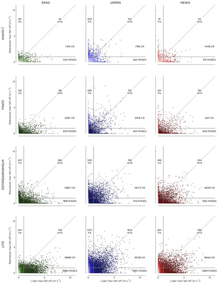For the comparison between the LiDAR measurements and the reanalyses, the grid point closest to the location of each observation station was selected; see Table 2. This implies that for observations close to land and for reanalyses with low resolution, there was a risk that the closest grid point was located in a grid box that did not perfectly resemble the conditions at the observation site. Figure 2 shows the example of Östergarnsholm, where the land/sea-mask from the reanalyses is plotted together with the grid. As can also be seen in Figure 2, the horizontal resolution is crucial to resolving the coastal zone and geographical features properly.