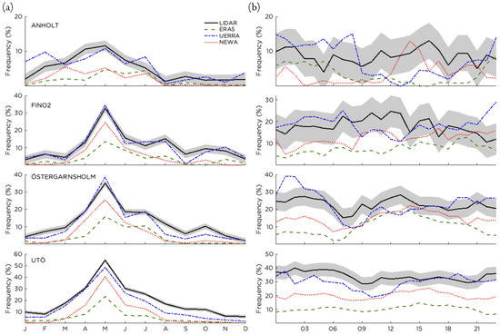 Previous studies (e.g., [18,74]) stated that reanalyses typically overestimate the height of the LLJ core and that the errors for the relative frequency of occurrence are reduced if reanalyses are allowed to stretch up to 500 m. However, this prevents a fair comparison of the jet’s core height and speed.