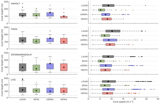 In order to compare the wind speed measured by the LiDARs with the reanalyses, the wind speed at 150 and 300 m was extracted. In some cases, the winds at these heights were explicitly given (such as for Östergarnsholm and UERRA); otherwise, the wind was calculated by fitting a piecewise cubic Hermite interpolating polynomial (PCHIP) [72,73] on a logarithmic height scale to the two levels closest to this height (observations) or to the full profile (reanalyses). Compared to a spline, the PCHIP concentrates the curvature closer to the interpolation points, thereby avoiding the typical swings that can occur with a spline while still enabling a continuous description of the profile. For the FINO2 observations, the wind speed at 300 m was extrapolated from the wind speed measurements at 240 and 280 m using the PCHIP.