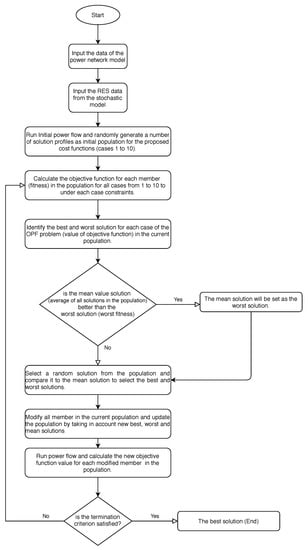 Recently, multiple new metaheuristics techniques have been developed motivated from social behaviors and ideology in humans to improve the performance of solving complex and non-linear problem such as OPF [,,,,]. The metaheuristic algorithms as part of modern optimization such as Gravitational Search Algorithm GSA [], Modified Particle Swarm Optimization (MPSO) [], Supply Demand-based Optimization SDO [], Chaotic map Grey Wolf Optimization (CGWO) [] and Teaching–Learning-Based Optimization (TLBO) [] are becoming increasingly popular for solving stochastic objective functions. In general, metaheuristic algorithms aim to search a wide variable space for promising solutions which are not neighbors to the current solution, and this search should be as extensive and random as possible. However, this search process will increase the computational cost, so the heuristic approaches may have a limited ability to find a global solution in efficient cost and no optimization algorithm can effectively solve all the optimization problems []. This motivated Nematollahi et al. [] to introduce new meta-heuristic optimization method called Golden Ratio Optimization Method (GROM) algorithm. In [], the growth search pattern is based on the golden ratio, which was developed by Fibonacci. The golden ratio aims to update the search solutions in two different phases, which simulate based on natural patterns such as snail lacquer []. The performance of GROM is tested using 35 benchmark test functions and engineering problems. The test results show that the proposed GROM reduces the computational cost and outperforms a number of well-known optimization methods []. The research study in [] has shown that a GROM can be beneficial for reducing power generation cost, fuel cost, gas emission and power losses in a power network equipped with RES; therefore, due to the volatility of the RES power profile and uncertainty in forecasts, a stochastic optimization strategy can have a significant impact on improving the energy performance of the power network. An adequate stochastic optimization scheme for a power network connected to RES is of great interest worldwide due to the potential significance of reducing electrical energy cost, saving and improving the environment, and improving energy efficiency performance in power networks. In addition, the studies on solving optimization problems [,,,,,] are sparse in the literature and there are no studies using the GROM for OPF problems or stochastic model to investigate the effect of changing locations of RES on the OPF. The stochastic prediction model for RES power generation is essential for developing an optimization model which can incorporate uncertainty in the RES and improve the power network performance.