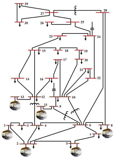 Figure 2. Scenario 1: IEEE 30-bus system. - Scenario 2: IEEE 30-bus Modified (1).An IEEE 30-bus Modified (1) is presented to investigate the impact of adding RES with stochastic power generation behavior to the reference power network, as seen in Figure A1. Here, the IEEE 30-bus system modified by replacing the thermal power generators at buses 5, 11, and 13 with solar PV at buses 5 and 13 as well as wind generator at bus 11. Furthermore, two new renewable generators (solar PV and wind generator) have been added at bus 24 and 30, respectively. The IEEE 30-bus Modified (1) specifications is described in Table A1. The general specifications and data for wind and solar system which connected to the IEEE 30-bus Modified (1) are presented in Table A2 and Table A3, respectively.