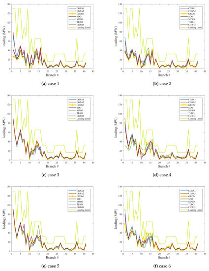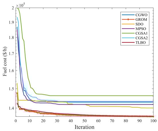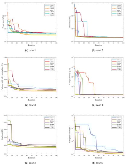 In this section, the results of the GROM algorithm are presented over ten cases of objective functions, as discussed in Section 2 in this paper. The GROM algorithm is compared to six metaheuristics optimization algorithms in this work, namely: Chaotic Gravitational Search Algorithm (CGSA)-1 [], MPSO [], CGSA2 [], SDO [], TLBO [] and CGWO []. First, the optimization algorithms result for single objective functions are discussed; then the algorithms are tested over multi-objective functions cases. Throughout this subsection, we will compare the optimization algorithms performance for a specific power network model using the following configurations: