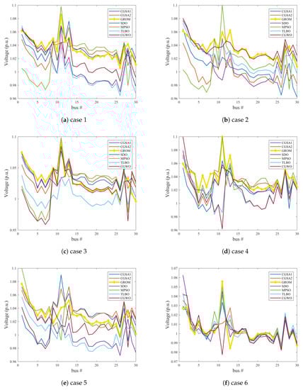 - Case 6: Voltage deviation cost function:The voltage quality and security in the electrical power network can be measured through a voltage deviation index. This index represents the cumulative voltage deviation from the nominal value of unity for all buses. This voltage deviation cost function is expressed in Equation (8) [,]: