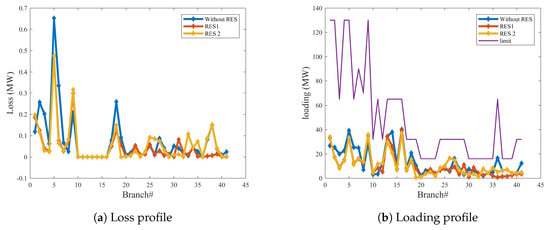 - Case 1: Real power loss minimizationIn this case the GROM is applied to solve the OPF problem for a power network with and without RES considering only the real power loss. By adding the wind and PV model as a negative load to the IEEE 30-bus system (Modified 1 and 2), the total load demand and power losses are reduced. Figure 6 shows the power loss and loading prolife for the three system cases: IEEE 30-bus system, IEEE 30-bus Modified (1) and IEEE 30-bus Modified (2). The power loss in IEEE 30-bus Modified (1) and IEEE 30-bus Modified (2) was reduced by 37.85% and 22.9%, respectively compared to IEEE 30-bus system without RES. The GROM results for case 1 and all other cases will be presented are compared to other proposed optimization methods in Section 3.3.