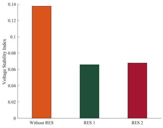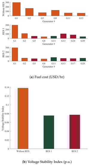- Case 7: Minimization of the cost of fuel of thermal power, wind, and solar PV generating units and voltage stability index.In this case, energy generation cost and voltage stability index was minimized as a multi-objective function for a power network with and without RES, as presented in Figure 12. By adding the wind and PV model to the IEEE 30-bus system (Modified 1 and 2) and using the GROM to solve the multi-objective OPF problem in this section, the total power generation cost is reduced. Figure 12a shows the total generations cost for the three power system cases: IEEE 30-bus system, IEEE 30-bus Modified (1) and IEEE 30-bus Modified (2). The total generations cost in IEEE 30-bus Modified (1) and IEEE 30-bus Modified (2) was reduced by 5.16% and 8%, respectively, compared to IEEE 30-bus system without RES. The generations cost reduction is basically coming from the increase in RES contribution power network. The wind and solar power generations were increased by 36% and 39%, respectively. In addition, the voltage stability index, as shown in Figure 12b, for IEEE 30-bus Modified (1) and IEEE 30-bus Modified (2) systems were reduced by 45.3% and 44.1%, respectively, as compared to IEEE 30-bus system.