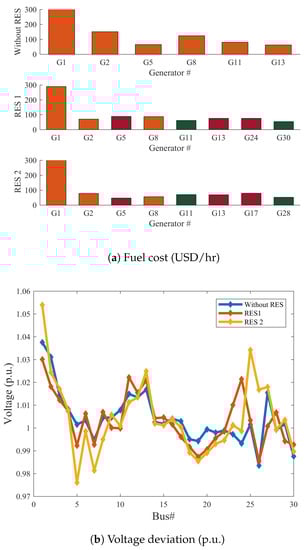 Figure 13. Fuel cost and Voltage deviation for case 8 for IEEE 30-bus system, IEEE 30-bus Modified (1) and IEEE 30-bus Modified (2). - Case 9: Minimization of power loss and total power generations cost.In this case the GROM is applied to solve multi-objective OPF problem for a power network with and without RES considering only the real power loss and the total power generations cost. Figure 14a shows that the total power generation cost in IEEE 30-bus Modified (1) and IEEE 30-bus Modified (2) was reduced by 10.87% and 7.56%, respectively, compared to IEEE 30-bus system without RES. In addition, the power loss in IEEE 30-bus Modified (1) and IEEE 30-bus Modified (2) was reduced by 23% and 19%, respectively, compared to IEEE 30-bus system without RES, as shown in Figure 14b.