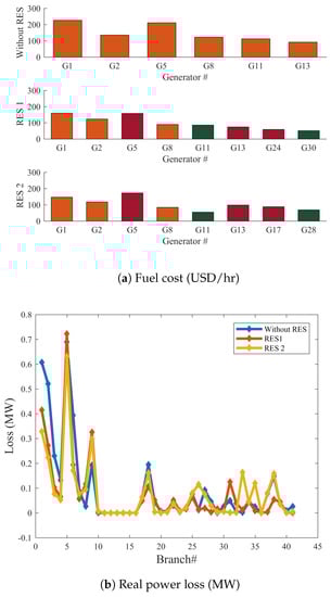 - Case 9: Thermal power loss and fuel generation cost:The thermal power losses and the basic power generation cost are merged in a cost function as follows [,]:where is a weight factor and is assumed to be 40 as in [].