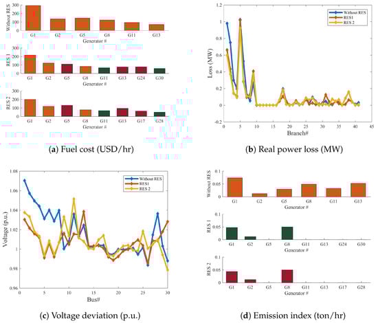 Figure 14. Fuel cost and Real power loss for case 9 for IEEE 30-bus system, IEEE 30-bus Modified (1) and IEEE 30-bus Modified (2). - Case 10: Minimization of the total power generations cost, voltage deviation, real power loss, and emission index.In order to evaluate the GROM algorithm performance with highly complex multi-objective function, case 10 is presented in this section. Here, the multi-objective function describes four terms: the total power generations cost, voltage deviation, real power loss, and gas emission index. In this section, the GROM is applied to solve the multi-objective OPF problem for power network incorporating RES (IEEE 30-bus Modified (1) and IEEE 30-bus Modified (2)), as shown in Figure 15. Firstly, the total generation cost was reduced by 6% and 6.9% for RES networks (IEEE 30-bus Modified (1) and IEEE 30-bus Modified (2)), respectively, compared to IEEE 30-bus without RES, as shown in Figure 15a. Similarly, the power loss reduction and voltage deviation was also improved by 23.6% and 40.8% for IEEE 30-bus Modified (1), respectively, as presented in Figure 15b,c. Finally, the gas emission index was reduced by 56% and 57% for RES networks (IEEE 30-bus Modified (1) and IEEE 30-bus Modified (2)), respectively, compared to IEEE 30-bus without RES, as shown in Figure 15d.