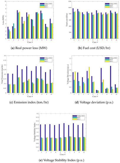 - Case 10: The power generation cost, gas emission index, voltage deviation and power losses [,]:In this case, a complex objective function with four main targets is presented. The cost function, Equation (12), includes the fuel cost, environmental emission index, voltage deviation index and power transmission losses terms.where ,, and are weight factors and are assumed to be 22, 21 and 19 as in [].