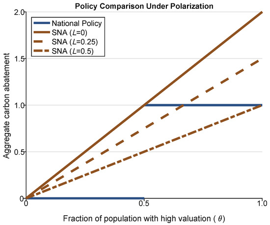 When the fraction of the population with a high valuation of climate action is over 50%, that is , it is less obvious why aggregate abatement remains higher in the SNA case that it does under the national policy. Let us first look at the national policy scenario. In this case, the aggregate amount of carbon abatement is chosen by a median voter with . This person chooses carbon abatement policy to maximize net benefits on climate action. In contrast in the SNA scenario, given the assumptions of the model, the SNA rallies the marginal participating jurisdiction to the brink of its participation constraint. Since all participating counties have the same valuation parameter, , all jurisdictions are marginal in this sense. Therefore, they are all united to undertake carbon abatement to the edge of their participation constraint, which is the point at which their net benefits on climate action are zero. So under these conditions, the SNA case leads to a much higher level of aggregate carbon emissions (i.e., net benefits on climate action are zero) compared to the national policy case (i.e., net benefits on carbon action are maximized).