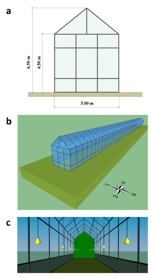 Solar greenhouse: (a) geometrical definition; (b) orientation; (c) lamp disposition.