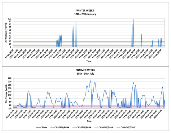 Figure 2 shows the air volume changes per hour guaranteed by the automatic window openings (C.00-W) resulting from the Equation (1) and the fixed air volume changes per hour equal to 5 vol/h (C.01-CMV/EAHX), 10 vol/h (C.02-CMV/EAHX), 15 vol/h (C.03-CMV/EAHX) and 20 vol/h (C.04-CMV/EAHX) provided by the CMV and EAHX systems.