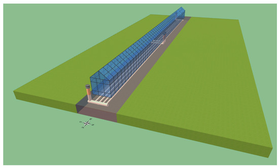 The analysis was carried out on a Venlo solar greenhouse characterized by a single span that covers an area of 500 m2 with a volume of 2750 m3, whose surfaces with the longest sides oriented to South and North [31]. As reported in Figure 1, the geometric parameters that characterize the solar greenhouse are:
