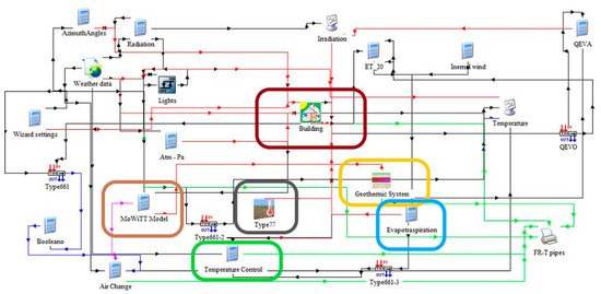 The greenhouse ventilation modelling was performed with TRaNsient SYstem Simulation Tool (TRNsys) [33]. It is a software designed for the analysis of complex systems capable of determining, with considerable detail, the transient performance of energy systems whose behavior varies over time. TRNsys software is characterized by an open modular structure and by a programming code. The simulation in TRNsys environment is realized through the connection of a series of Types, identified in an already existing library, within the Simulation Studio interface.
