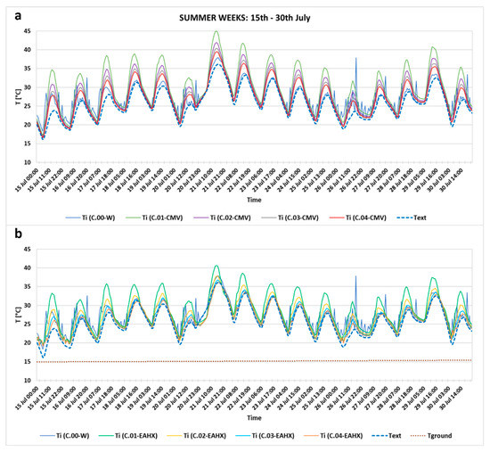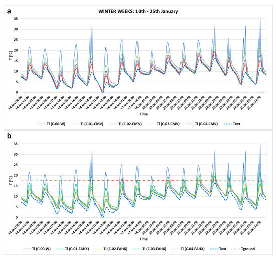 A further analysis has been conducted for the coldest and highest days of the year, as reported in Figure 9 and Figure 10, respectively. In Figure 9 for winter, it is interesting to note that, although the EAHX is not the solution that raises the temperature the most during the day, its use allows to flatten the thermal wave more. In fact, the trend is almost constant during the day, raising the temperature during the first and last hours of the day, thanks to the rather constant temperature of the ground during the day. With fewer air volume changes per hour (C.01-EAHX), the EAHX system allows to reach the highest temperature peaks, while with more air volume changes per hour the flattening of the curve is more evident all day.