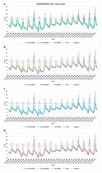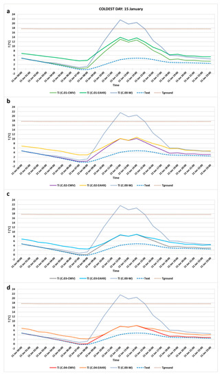 Winter comparison of the internal air temperature between C.01-CMV and C.01-EAHX (a), C.02-CMV and C.02-EAHX (b), C.03-CMV and C.03-EAHX (c) and C.04-CMV and C.04-EAHX (d): 15th January.