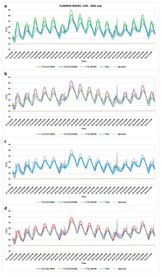 Summer comparison of the internal air temperature between C.01-CMV and C.01-EAHX (a), C.02-CMV and C.02-EAHX (b), C.03-CMV and C.03-EAHX (c) and C.04-CMV and C04-EAHX (d): 15th–30th July.