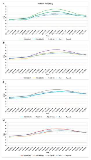 Summer comparison of the internal air temperature between C.01-CMV and C.01-EAHX (a), C.02-CMV and C.02-EAHX (b), C.03-CMV and C.03-EAHX (c) and C.04-CMV and C04-EAHX (d): 21st July.
