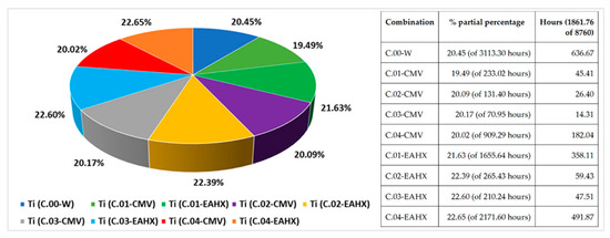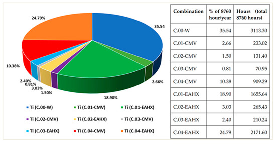 A first simulation is made by discarding combinations with 20 air changes per hour, excluding C.04, to reduce energy consumption. Figure 11 shows, as a percentage, how many times the different hourly air exchange values have been used. In other words, for example, the percentage of 40.78% for (C.00-W) means that natural ventilation has been used for 3572 h (40.78% of 8760 h/year). Following this, combinations with 5 (C.01-EAHX) and 15 (C.03-EAHX) air volume changes per hour with the geothermal system are used, during the year, with percentages of 18.98 and 20.71, respectively. Analyzing Figure 11, the ventilation method that gives the smallest deviation from the temperature range 16–21 °C is C.00-W, as it covers 40.78% of the total hours of a year.